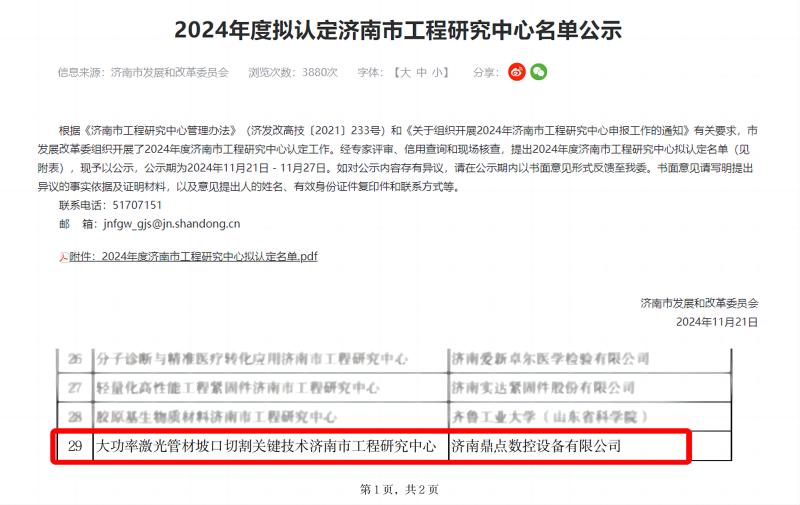 2024年11月28日,“大功率激光管材坡口切割關鍵技術濟南市工程研究中心”成功獲批。該中心由濟南鼎點數控設備有限公司與山東省科學院自動化研究所聯合申報,中心的研究方向是為大尺寸金屬管件、構件的復雜加工提供一站式解決方案,設備可作為工業4.0系統終端,提供互聯網終端接口與信息交互軟件,并入ERP系統、遠程操控軟件、故障遠程監控、信息自動采集,為工業自動化、無人化提供底層平臺。